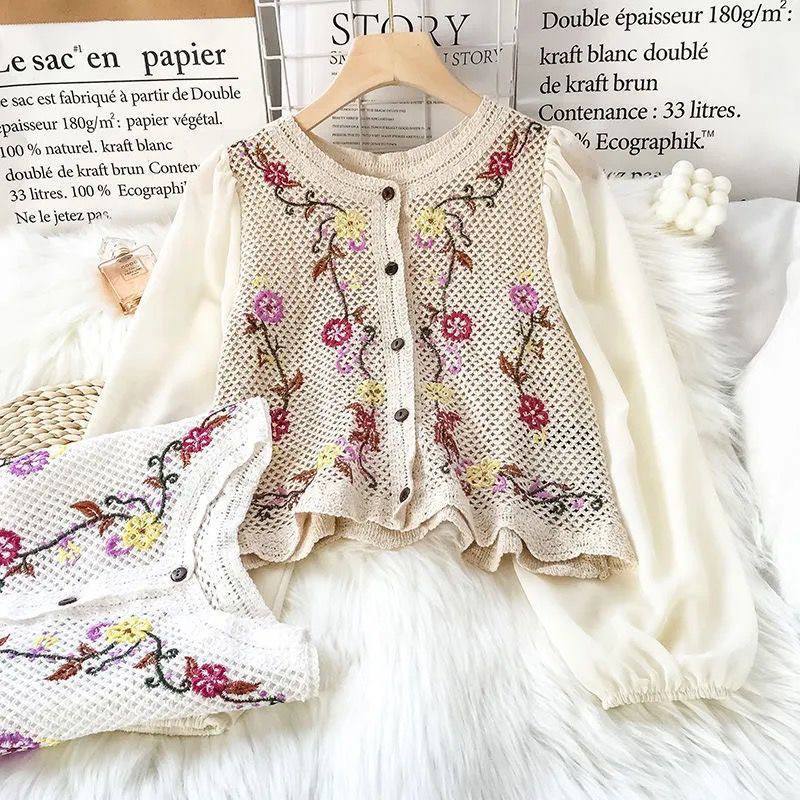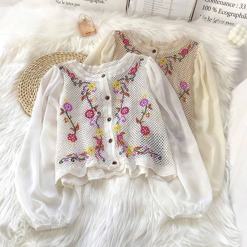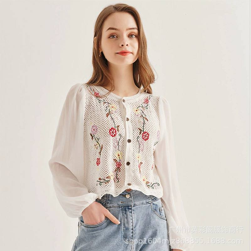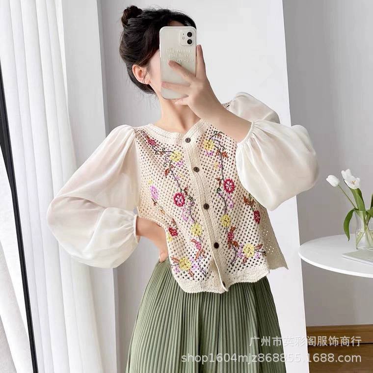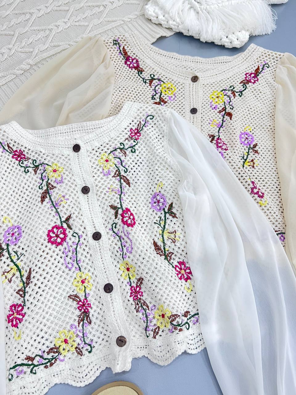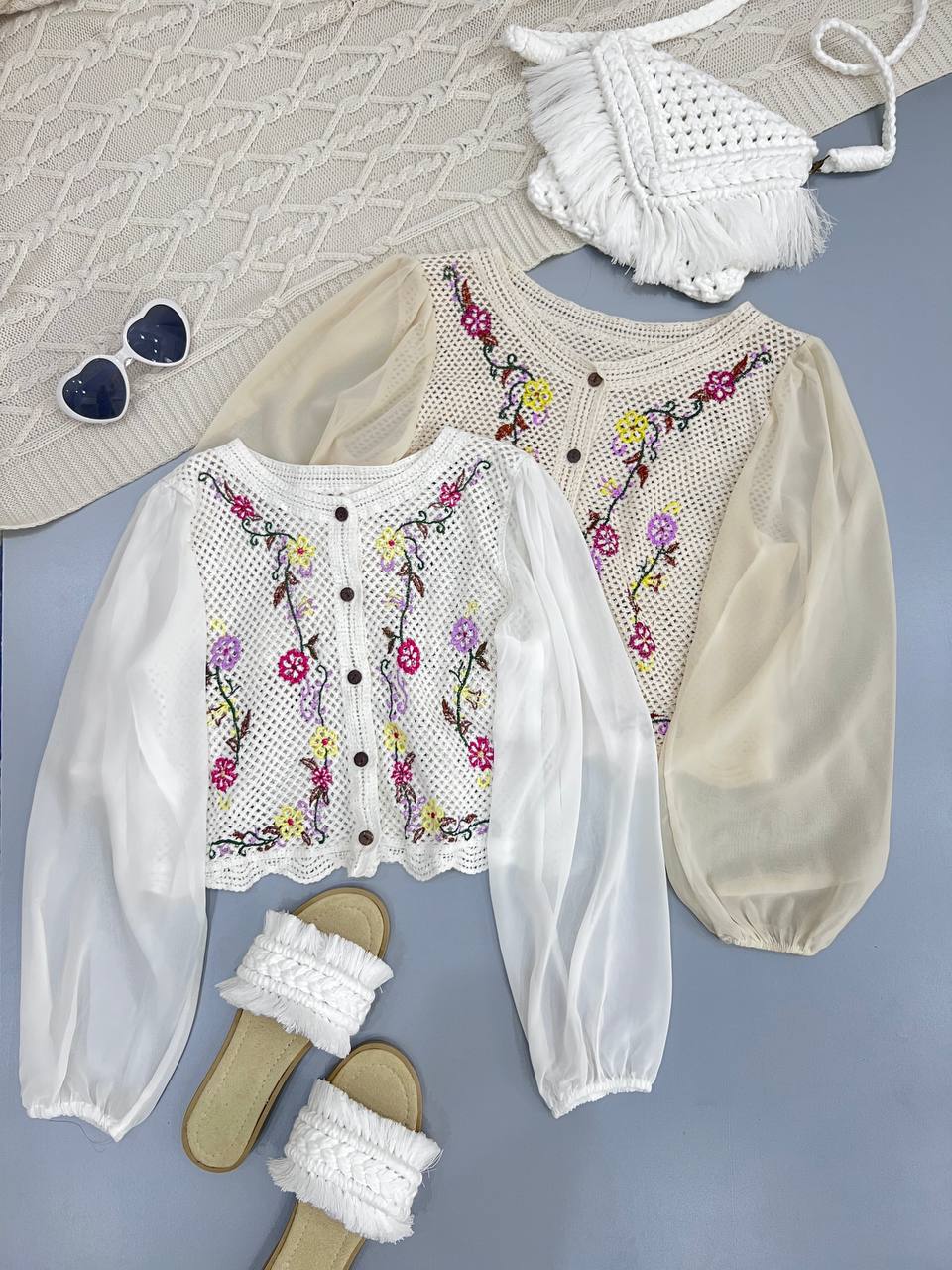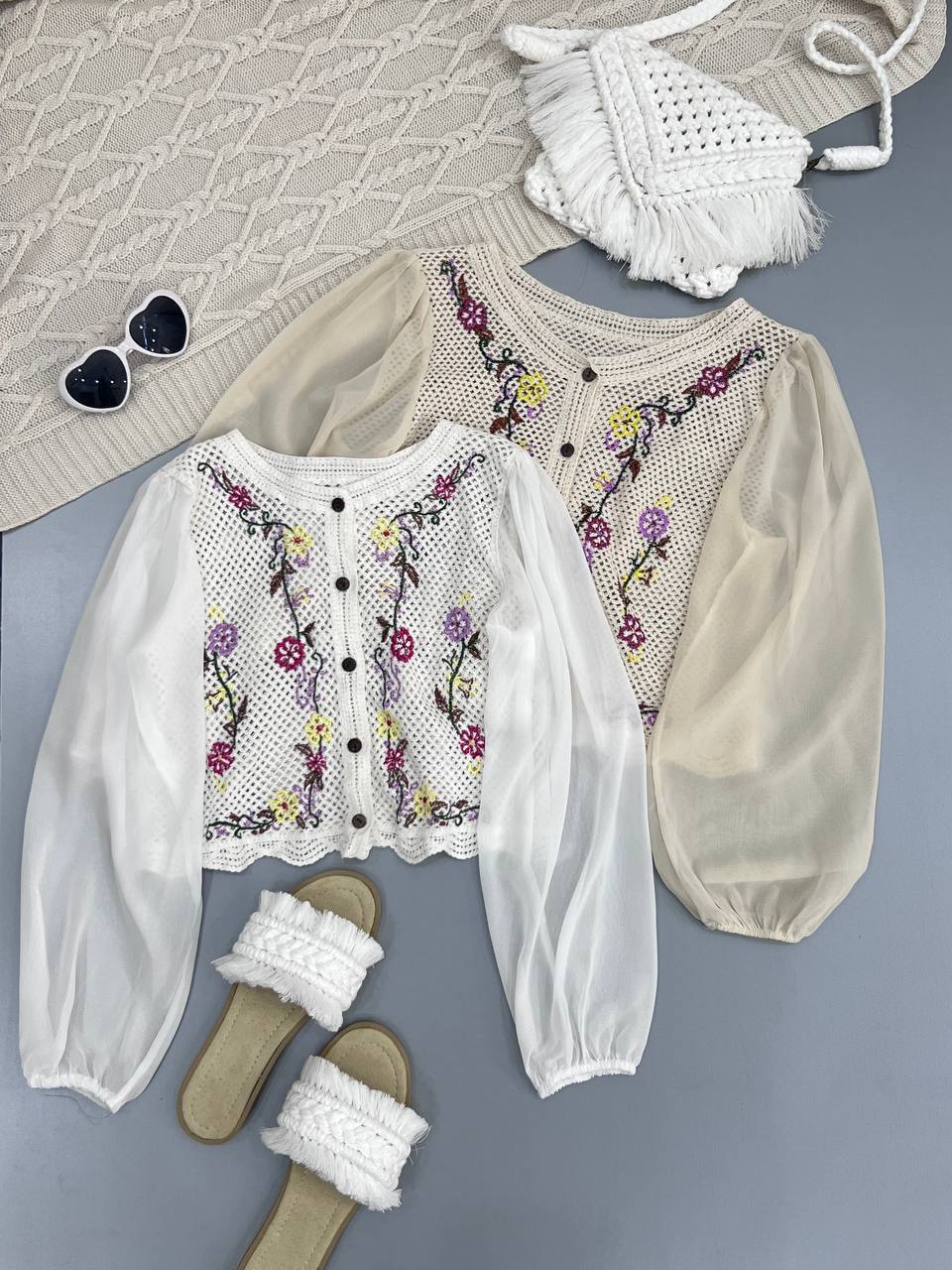 شومیز زنانه خارجی بافت قلاب دوزی استین حریر ۵۳۶۸